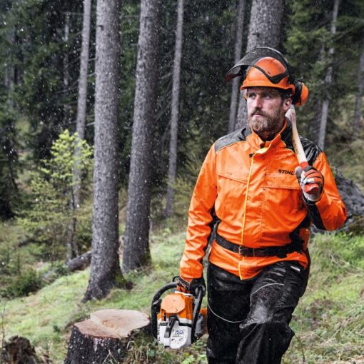 In materiale impermeabile elastico e resistente. Colore arancione segnaletico, tessuto esterno: 100 % poliestere, rivestimento: 100% poliuretano. Ampie zone di colore arancione segnaletico. Colonna d’acqua: ≥ 5.000 mm. Traspirante grazie alle aperture di aerazione su maniche, davanti e dietro. Cappuccio ripiegabile nel colletto. Con certificazione del valore d’uso KWF.